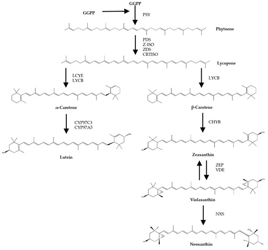 Scheme of biosynthetic steps of microalgal carotenoids (adapted from Valera J.C. et al. (2015) [6], and Lichtenthaler H.K. et al. (2012) [7]). GGPP: Geranylgeranyl pyrophosphate; PSY: Phytoene synthase; PDS: Phytoene desaturase; Z-ISO: ζ-Carotene isomerase; ZDS: ζ-Carotene desaturase; CRTISO: Carotene isomerase; LCYE: Lycopene ε-cyclase; LCYB: Lycopene β-cyclase; CYP97C3: Cytochrome P450 ε-hydroxylase; CYP97A5: Cytochrome P450 β-hydroxylase; CHYB: Carotene β-hydroxylase; BKT: β-Carotene oxygenase; ZEP: Zeaxanthin epoxidase; VDE: Violaxanthin de-epoxidase; NXS: Neoxanthin synthase.
