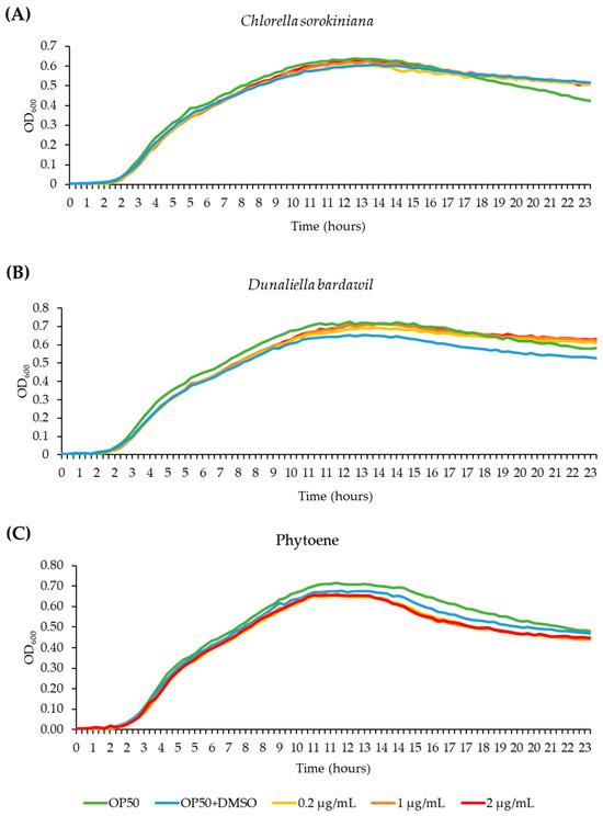Phytoene-rich extracts and phytoene do not alter growth of the C. elegans food source E. coli OP50. (A–C) Bacterial growth curves (OD600) of E. coli OP50 cultivated with 0.2 µg/mL, 1 µg/mL, and 2 µg/mL C. sorokiniana extracts (A), D. bardawil extracts (B), and phytoene standard (C). Three biological replicates were performed.