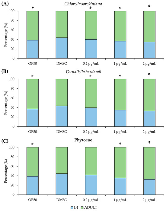 Phytoene-rich extracts and phytoene do not alter development of C. elegans. (A–C) Percentage of animals that have reached L4 (larval, pre-adulthood) stage and adulthood. Animals were treated with 0.2 µg/mL, 1 µg/mL, and 2 µg/mL C. sorokiniana extracts (A), D. bardawil extracts (B), and phytoene standard (C). Extracts were dissolved in DMSO. Controls were OP50: standard culture without supplementation, and DMSO: supplementation with DMSO only. Three biological replicates, n = 200–300 per condition. *, p < 0.05 with Fisher’s exact test compared to DMSO.