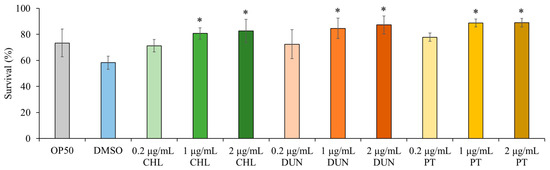 Phytoene-rich extracts and phytoene increase resistance to oxidative stress. Survival after exposure to 400 µM juglone scored after exposure for 8 h shown. OP50: Controls grown in standard conditions without supplementation; DMSO: Control supplemented with DMSO; CHL: C. sorokiniana extracts dissolved in DMSO; DUN: D. bardawil extracts dissolved in DMSO; PT: Phytoene dissolved in DMSO. Data are represented as mean ± SD from three independent experiments with total number of animals n > 150 for each condition. *, p < 0.05 versus the control (DMSO) indicate statistically significant differences (p < 0.05) between conditions with one-way ANOVA.
