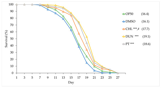 Phytoene-rich extracts and phytoene extend lifespan. Survival curves of C. elegans treated with phytoene and phytoene-rich extracts. CHL: C. sorokiniana [1 µg/mL]; DUN: D. bardawil [1 µg/mL]; PT: Phytoene [1 µg/mL]. Data are represented as composites of three replicates, with median lifespan indicated in parenthesis. Total number of animals n > 120 for each condition. ***, p < 0.001; ns: Not significant and #, p = 0.0399, comparing phytoene-enriched D. bardawil and phytoene-enriched C. sorokiniana extracts with Kaplan–Meier and Gehan–Breslow–Wilcoxon tests.