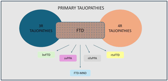 The term “tauopathy” refers to a group of neurodegenerative disorders with heterogeneous biochemical, morphological, and clinical signs, although they all share the symptoms of cognitive decline and dementia [6]. These diseases are characterized by the pathological accumulation of a family of intrinsically disordered proteins, the highly soluble microtubule-associated protein tau (MAPT), which are localized in the CNS and expressed especially in neurons, although they may also be detected in glial cells and extracellular space (e.g., interstitial fluid and cerebrospinal fluid) [7,8,9,10]. More than 26 different tauopathies are currently known, encompassing a wide range of phenotypically diverse diseases that, along with FTD, also include, among others, AD, argyrophilic grain disease (AGD), corticobasal degeneration (CBD), chronic traumatic encephalopathy (CTE), Parkinson’s disease (PD), Pick’s disease (PiD), and progressive supranuclear palsy (PSP) [8,10,11]. In humans, tau proteins are encoded by a single gene, MAPT, located on chromosome 17q21 and comprising 16 exons, whose expression, following the alternative messenger RNA (mRNA) splicing of exons 2, 3, and 10, gives rise to six distinct isoforms [9,11]. In particular, the presence or absence of exon 10 in the microtubule-binding compartments leads to the generation of six isoforms with four repeated microtubule-binding domains (4R) or with three microtubule-binding domains (3R) [10]. Thus, tauopathies can be classified into 3R tauopathies (mainly containing 3R tau), 4R tauopathies (with a main prevalence of 4R tau), and 3R/4R tauopathies (having an almost equal distribution between 3R and 4R tau contents; see Table 1) [9,10,12]. Interestingly, the presence of an extra copy of exon 4 generates a high-molecular-weight isoform, known as “big tau”, which has been speculated to improve axonal transport and, due to the paucity of phosphorylated sites and their increased size, to have a low propensity for aggregation [13]. Physiologically, tau resides in neuron axons, where it promotes the assembly and stabilization of microtubules, contributing to regulating axonal transport and neurite growth, and in the nucleus, where it binds directly to adenine–thymine-rich α-satellite heterochromatin, regulating DNA packaging [11,14]. If tau normally undergoes post-translational modifications (phosphorylation, acetylation, methylation, ubiquitination, truncation), the hyperphosphorylation of serine and threonine residues in tau isoforms results in the disruption of tau–microtubule interaction and the consequent instability of the cytoskeleton, and also enhances the ability of tau to self-aggregate and accumulate in intracellular insoluble neurofibrillary tangles (NFTs), as was recently shown in vitro [9,15,16,17]. Furthermore, based on the so-called “prion paradigm”, experimental studies using cell cultures and animal models have documented that tau aggregates exhibit prion-like seeding properties; therefore, tau may proliferate as a misfolded protein according to a “nucleation elongation” process and propagate systematically along connected neurons through both synaptic contacts and non-synaptic mechanisms [11,18]. Tau propagation can ultimately result in the impairment of axonal transport, neuronal dysfunction, and neurodegeneration, eventually leading to cell death, although the propagation of tau aggregates appears to be independent of toxicity, showing some features that do not reflect the “prion-like” model [19,20].