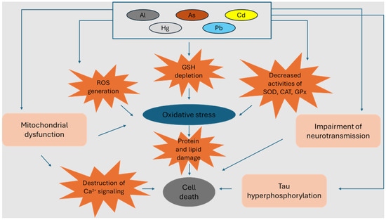 - Although, like Cd, Pb is a redox-inactive metal, it can induce oxidative stress through increased ROS generation and GSH depletion by binding to sulfhydryl groups. In addition, Pb inactivates antioxidant enzymes such as SOD, CAT, GPx, GR, and glutathione-S-transferase, causing a further reduction in GSH reserves [184,186]. Like other toxic metals, Pb accumulates in the mitochondria and, by disrupting Ca2+ homeostasis, may favor the increase in intracellular Ca2+, which, by enhancing mitochondrial ETC, can lead to an increase in ROS production [183]. A recent study also revealed that neuronal cells exposed to Pb and Aβ were characterized by a depolarization of the mitochondrial membrane potential, a decrease in ATP levels and mtDNA copy numbers, and the disruption of ETC through a reduced expression of genes and proteins of the ETC complex [187].