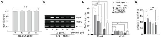 MMP3 and MMP13 expressions were downregulated by TLE in IL-1β-treated mouse articular chondrocytes. Chondrocytes were treated with TLE (10, 20, and 50 ng/mL) with or without IL-1β treatment (A–D). (A) Toxicity of TLE in chondrocytes. Cell viability was evaluated using a lactate dehydrogenase assay after 12 h of incubation. (B,C) The expression levels of MMP3, MMP13, and IL-6 were examined using PCR and quantified through qRT-PCR (n = 5). (D) Collagenase activity of MMPs was measured using a collagenase assay kit. The data are shown as the mean ± standard deviation (SD) and were analyzed using one-way ANOVA with Dunnett’s multiple comparisons test. (n = 5). ** p < 0.01, *** p < 0.001, **** p < 0.0001, and n.s. = not significant. TLE: Tisochrysis lutea extract.