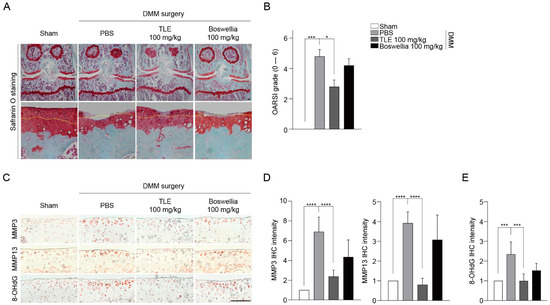 To verify the in vivo function of TLE, we generated DMM-induced OA models and administered TLE orally to mice with OA induced by DMM. The results of Safranin O staining and OARSI grading (Figure 2A,B) show that the protective effect of TLE against OA was higher than that of the positive control Boswellia, a widely used remedy for arthritis in traditional folk medicine [35,36]. Cartilage degradation caused by MMPs may contribute to inflammation, leading to the increased production of ROS [5,37]. Subsequently, we examined whether TLE exhibits anti-catabolic and antioxidant properties in the progression of OA. The immunohistochemistry (IHC) analysis revealed that TLE inhibited the production of MMP3 and MMP13 in DMM-induced OA models (Figure 2C,D). 8-OHdG is specifically generated when the DNA base guanine is oxidized by ROS [38]. IHC experiments conducted on mouse cartilage revealed that TLE reduced 8-OHdG levels (Figure 2C,E), suggesting that TLE not only prevents MMP-induced cartilage destruction but also reduces oxidative stress levels in the cartilage of OA-induced mice.