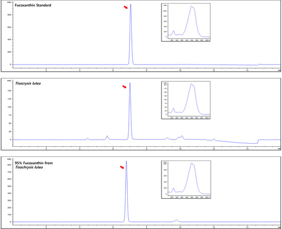 Analysis of fucoxanthin from TLE. High-performance liquid chromatography (HPLC) chromatogram of fucoxanthin standard (upper), TLE (middle), and fucoxanthin isolated from TLE (lower). The elution of samples in each HPLC was analyzed by measuring absorbance at 450 nm, and red arrows indicate the fucoxanthin peak in each chromatogram. The inset displays the absorption spectrum for the peak of fucoxanthin. TLE: Tisochrysis lutea extract.