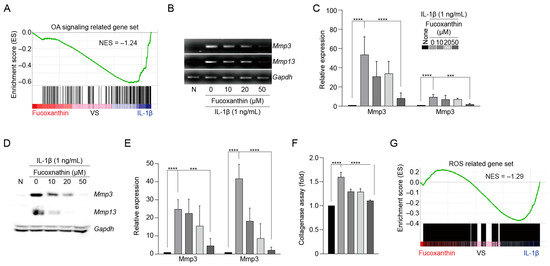 Chondrocytes were simultaneously treated with IL-1β and fucoxanthin in varying doses, and the expression of catabolic factors was examined through in silico and biochemical methods. First, we performed GSEA to determine whether fucoxanthin inhibited catabolic factor expression under IL-1β-treated in vitro conditions. The gene set in cells under fucoxanthin treatment was positively correlated with a previously reported OA gene signature (Figure 4A). OA-related genes, including those encoding MMP3 and MMP13, are the main factors in cartilage destruction [8,15,16,18]. Here, we found that the transcript levels of MMP3 and MMP13 were suppressed in IL-1β-induced OA mimic conditions (Figure 4B,C). Additionally, we examined whether their protein levels were decreased in fucoxanthin-treated cells. We found that fucoxanthin inhibited MMP3 and MMP13 protein expression and collagenase activity in a dose-dependent manner in IL-1β-treated chondrocytes (Figure 4D–F). GSEA demonstrated that fucoxanthin effectively suppressed ROS production-related gene signature (Figure 4G). Furthermore, CellROX demonstrated that TLE or fucoxanthin reduced ROS production by confocal microscopy analysis in IL-1β-treated chondrocytes (Figure S1), consistent with the GSEA data. Therefore, it can be concluded that TLE-derived 95% pure fucoxanthin has anti-inflammatory activity, suggesting that fucoxanthin has potential as a novel antioxidant for OA therapy.