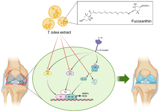 This study aimed to examine the effects of TLE as a natural therapeutic agent for preventing OA. T. lutea is a marine microalga that contains a wide range of bioactive chemicals, making it an interesting prospect for phytotherapy research. We investigated the efficacy of TLE as a natural fucoxanthin source. Additionally, we found that TLE and its predominant ingredient, fucoxanthin, are organic compounds that can prevent OA by inhibiting processes that break down the cartilage. Our investigation revealed that the oral administration of TLE reduced OA progression by reducing cartilage damage. Furthermore, we discovered that the TLE-derived compound fucoxanthin inhibited the MAPK and NF-κB signaling pathways, thereby reducing the production of catabolic factors (MMP3, MMP13, and ROS). Therefore, we suggest that the incorporation of TLE or fucoxanthin into therapeutic agents could be a potential avenue to treat OA. However, further investigation is needed to determine whether fucoxanthin produces this effect by directly blocking the IL-1 receptor, which is similar to an IL-1 receptor antagonist. According to previous studies, synoviocytes are also affected by IL-1β, leading to similar effects on the cartilage in OA as chondrocytes [49]. Therefore, T. lutea and fucoxanthin may show similar effects on synoviocytes by inhibiting IL-1β-induced inflammatory responses. Moreover, previous reports demonstrated that the oral administration of 65 mg/kg of fucoxanthin in rats for 30 min resulted in the rapid conversion of fucoxanthin to fucoxanthinol in the plasma [50,51]. Additional research is needed to confirm the effectiveness of fucoxanthin in treating patients with OA. We anticipate that the findings of this study, along with future research, will show that TLE and fucoxanthin can effectively address the underlying causes of OA in humans.