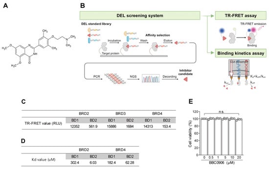 Novel bromodomain and extra-terminal domain inhibitors (BETi) were identified by screening a DNA-encoded chemical library (DEL) provided by WuXi AppTec (Shanghai, China) using the BD1 and BD2 domains of BRD2, BRD3, and BRD4 proteins. Proteins were generated by amplifying the relevant gene sections encoding BRD2, BRD3, and BRD4, followed by their cloning into pET28a vectors (Novagen, Northumberland, UK). These constructs were transformed into Escherichia coli BL21(DE3) cells (Novagen), and protein expression was induced through incubating with 0.2 mM isopropyl β-D-thiogalactopyranoside (IPTG) for 16 h at 18 °C. Bacterial cells were harvested, resuspended in lysis buffer (50 mM Tris, pH 8.2, Thermo Fisher Scientific, Waltham, MA, USA; 300 mM NaCl, LPS Solution, Daejeon, Republic of Korea; and 20 mM imidazole, Sigma-Aldrich, St. Louis, MO, USA), and then sonicated. The lysates were centrifuged at 1550× g for 1 h at 4 °C, and the supernatant was loaded onto a HisTrap HP nickel affinity column (GE Healthcare, Chicago, IL, USA). The column was washed, and BRD2, BRD3, and BRD4 were eluted using 50 mM Tris buffer (pH 8.2) containing 300 mM NaCl and 500 mM imidazole.