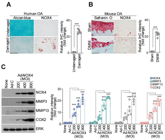 NOX4 upregulation in cartilage induces OA pathogenesis. (A) NOX4 protein levels in damaged and undamaged samples (left panel) were compared, and NOX4 protein levels in undamaged and damaged human knee joint cartilage were compared using IHC (scale bar = 100 μm) (right panel). (B) Ten weeks after DMM surgery was performed on C57BL/6 mice, the extent of cartilage degradation was assessed using safranin O staining (left panel). Additionally, NOX4 protein expression level in the cartilage was determined using IHC staining (scale bar = 100 μm) (right panel). (C) Mouse chondrocytes were infected with the NOX4 adenovirus. The expression levels of MMP3, MMP13, and COX2 were confirmed using Western blotting (left panel). The expression levels of each protein were normalized to those of ERK and are presented as relative values among the groups (right panel). Data are presented as the mean ± SEM as results of the analysis using the Mann–Whitney U test (A,B) and one-way ANOVA with Tukey’s post hoc test (n = 5) (C). Significant differences from the PBS (control) group are denoted as * p < 0.05, ** p < 0.01, and *** p < 0.001.