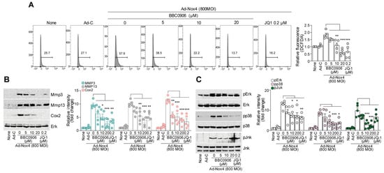 In addition, treatment with BBC0906 reduced the expression of catabolic factors that were increased by NOX4 (Figure 3B). In OA, catabolic factors are primarily regulated by MAPK signaling. Therefore, we investigated the effect of BBC0906 on MAPK signaling and found that MAPK signaling, which was activated by NOX4, was decreased by BBC0906 (Figure 3C). This reduction occurred because BBC0906 suppressed pathways downstream of NOX4. For example, BBC0906 suppresses MAPK signaling, which is activated by NOX4 overexpression in mouse articular chondrocytes.