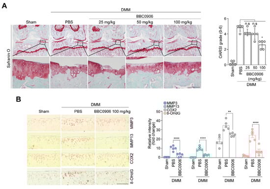 BBC0906 suppressed cartilage degradation and ROS production and alleviated OA. (A,B) C57BL/6 male mice (12 weeks old) underwent DMM surgery, received intra-articular injections of BBC0906 once a week, and were analyzed after being euthanized 10 weeks after surgery. For histological analysis, safranin O staining was conducted (scale bar = 100 μm) ((A), left panel), and OA severity was evaluated using the OARSI grade ((A), right panel). The protein levels of the catabolic factors and ROS were obtained using IHC staining ((B), left panel) and were analyzed in each sham group ((B), right panel). Data are presented as the mean ± SEM as results of the one-way ANOVA with Tukey’s post hoc test (n = 5) (A) and Kruskal–Wallis with Dunn’s post hoc test (n = 5) (B). Significant differences from the PBS (control) group are denoted as follows: * p < 0.05, ** p < 0.01, **** p < 0.0001, and n.s = not significant.