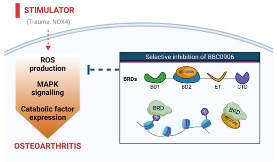 Therefore, 2-(4-(2-(dimethylamino)ethoxy)-3,5-dimethylphenyl)-5,7-dimethoxyquinazolin-4(3H)-one (BBC0906) has been developed as a BD2-specific inhibitor. BBC0906 reduces ROS production and mitogen-activated protein kinase (MAPK) signaling, leading to the reduced expression of catabolic factors that degrade cartilage. Moreover, in an animal model of OA, the intra-articular injection of BBC0906 inhibited the induction of OA and reduced the levels of ROS-related factors in joints.