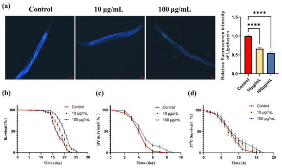 3.3. ARE Reduced the Accumulation of Lipofuscin and Prolonged the Life Span of C. elegans
