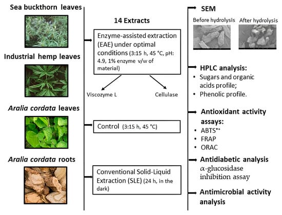 Januskevice, V.; Gomes, A.M.; Sousa, S.; Barbosa, J.C.; Vedor, R.; Martusevice, P.; Liaudanskas, M.; Zvikas, V.; Viskelis, P.; Cesoniene, L.; et al. Phytochemical and Functional Diversity of Enzyme-Assisted Extracts from Hippophae rhamnoides L., Aralia cordata Thunb., and Cannabis sativa L. Antioxidants 2024, 13, 950. https://doi.org/10.3390/antiox13080950