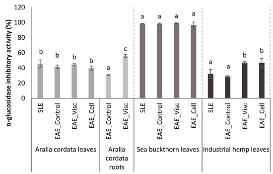 | Aralia cordata roots | EAE_Control | 2.88 ± 0.50 a | 1.49 ± 0.08 a | 6.77 ± 0.38 a |