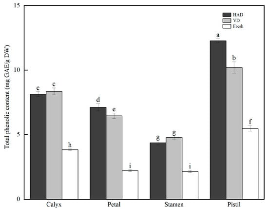 3.1. Changes in Total Phenolic Content in Different Parts of Pitaya Flowers after HAD and VD Treatments