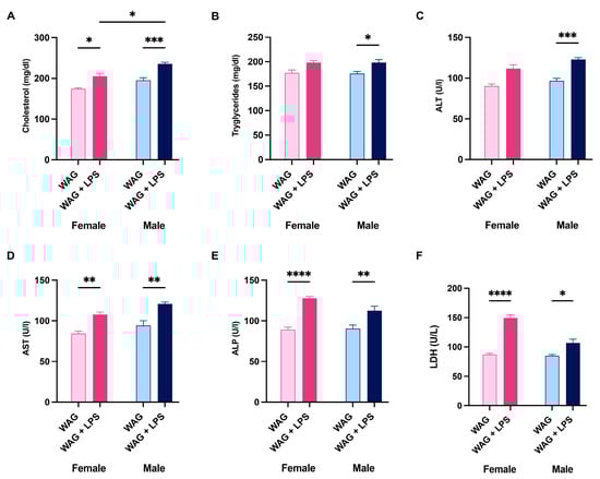 Sex differences in serum biochemical and hepatic parameters in WAG/Rij rats following LPS challenge. Serum (A) cholesterol and (B) triglycerides, (C,D) transaminases, (E) ALP, and (F) LDH were measured in all experimental groups (n = 6–7 animals each group) by ELISA assay. Data are presented as mean ± SEM. * p < 0.05, ** p < 0.01, *** p < 0.001, and **** p < 0.0001.