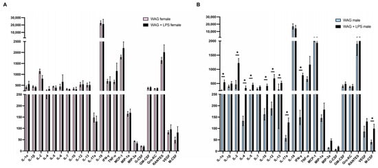 Intergender comparisons between male and female epileptic rats exposed to LPS at PND3 showed a similar increase in lipid serum profile, such as elevated cholesterol and triglycerides (Figure 1A,B), as well as higher levels of hepatic transaminases ALT and AST, ALP, and LDH (Figure 1C–F). No difference was observed between female and male WAG without LPS challenge in Figure 1. Notably, we showed a marked susceptibility of male epileptic rats rather than females to LPS-induced systemic inflammation, as proven by the higher serum levels of twelve out of twenty-three pro- and anti-inflammatory cytokines analyzed by BioPlex assay (Figure 2A,B). Specifically, LPS-challenged males showed increased serum concentrations of inflammatory and immune mediators (i.e., IL-1α, IL-12, and IL-13) and T cell-derived cytokines (i.e., IFN-γ, IL-2, IL-4, and IL-5). Other markers were also examined, such as IL-10, IL-17A, and M-CSF, which regulates the mobilization of neutrophils and macrophages/monocytes against bacterial infection. Their modulation in males suggested an attempt to counteract the damage caused by LPS. No intragender differences in female groups were found (Figure 2A). Intergender comparisons between male and female groups without LPS evidenced higher concentrations of some inflammatory cytokines and mediators of innate and adaptative immunity in females than in males (Supplementary Figure S2).
