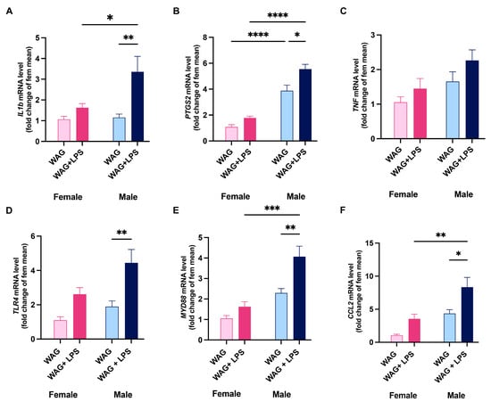 In the liver, we confirmed that male WAG/Rij rats were more prone to tissue inflammation and immune response to early LPS exposure compared with female animals. Indeed, we showed that the LPS challenge markedly increased the transcription of IL-1β, COX-2 (Figure 3A,B), as well as that of TLR4 and MyD88 (Figure 3D,E) and the monocyte chemoattractant protein (MCP)1 (Figure 3F). Notably, no statistical intergender and intragender difference was found in the mRNAs of TNF-α (Figure 3C).