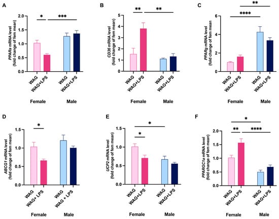 Early endotoxin challenge induced a marked alteration in the hepatic lipid metabolism of female WAG/Rij rats, reducing the mRNAs of PPAR-α (Figure 4A), involved in the regulation of fatty acid oxidation (FAO) and increasing CD36 (Figure 4B), a key marker of steatosis. Moreover, LPS-insulted females showed a marked reduction of ABCG1 and UCP-2 transcription (Figure 4D,E), a mitochondrial ATP-dependent transporter and a liver-specific uncoupling protein, respectively. The mitochondrial damage was also suggested by the compensatory increase of PGC1-α (Figure 4F), a marker of mitochondrial biogenesis. No difference was found in PPAR-γ mRNAs in LPS-treated females vs. untreated ones (Figure 4C). Notably, intergender evaluations in unchallenged rats revealed marked differences in hepatic lipid metabolism. Indeed, we showed a significant increase in PPAR-γ expression (Figure 4C) and the reduction of PGC1-α (Figure 4D) and UCP2 (Figure 4F) in epileptic male rats rather than females.