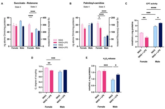 Sex-based differences in hepatic mitochondrial bioenergetics of WAG/Rij rats following post-natal endotoxin injection. Mitochondrial respiration in the presence or not of (A) succinate-rotenone and (B) palmitoyl carnitine as substrates was assessed in the liver of all animals by polarographic measurements (n= 5–6 animals in each group). (C) CPT activity, (D) the degree of coupling, and (E) H2O2 release into the isolated hepatic mitochondria of female and male WAG/Rij rats were measured by spectrofluorimetric analysis at PND45 (n = 6–7 animals in each group). Data are presented as mean ± SEM. * p < 0.05, ** p < 0.01, *** p < 0.001, and **** p < 0.0001.