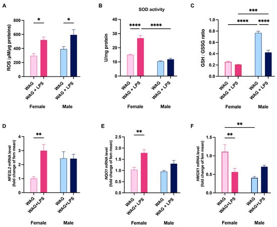 Finally, we demonstrated that the LPS challenge induced oxidative damage in the livers of both genders increasing ROS production (Figure 6A). This LPS effect led to a gender-related activation of hepatic antioxidant defense, characterized by the increased mitochondrial SOD activity only in females (Figure 6B) and the altered hepatic glutathione redox status (GSH/GSSG ratio) in solely male WAG/Rij (Figure 6C). This latter finding was consistent with the increased H2O2 release, suggesting remarkable oxidative damage in challenged male rats. Notably, the LPS challenge also differently modulated the hepatic detoxifying system in female epileptic rats, increasing the gene expression of NRF-2 (Figure 6D) and its associated NQO1 (Figure 6E), while reducing HO-1 transcription (Figure 6F). No changes in the detoxifying system were revealed in male animals, injected or not with LPS (Figure 6D–F). However, in LPS-challenged females, the sustained antioxidant defense exerted by increased SOD activity and detoxifying factors cannot compensate for the increase in free radical production (Figure 6A).