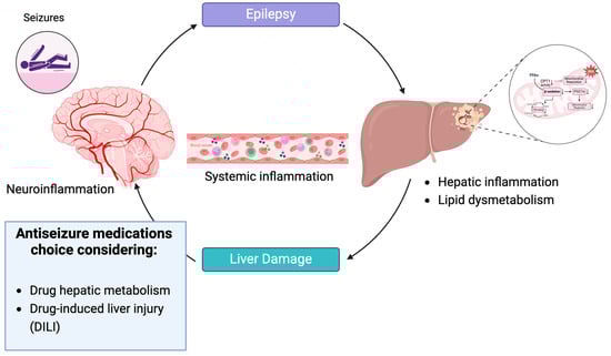 In vivo studies have demonstrated that systemic and central nervous system inflammation is the main actor in the relationship between seizure predisposition and the development of nonalcoholic fatty liver disease (NAFLD) []. Indeed, severe early-life infections leading to sepsis may result in triggering hepatic and neuro-inflammation that can aggravate epilepsy. Furthermore, NAFLD has been recently identified as an independent risk factor for sepsis in a large clinical cohort, showing a strong relationship between mortality in NAFLD-associated sepsis and hepatic mitochondrial and energetic metabolism dysfunction [].