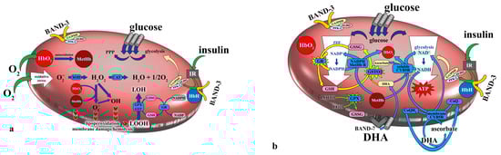 - Turpin, C.; Catan, A.; Guerin-Dubourg, A.; Debussche, X.; Bravo, S.B.; Álvarez, E.; Van Den Elsen, J.; Meilhac, O.; Rondeau, P.; Bourdon, E. Enhanced oxidative stress and damage in glycated erythrocytes. PLoS ONE 2020, 15, e0235335. [Google Scholar] [CrossRef] [PubMed]