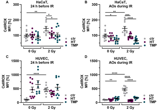 First, we investigated the basic effect of HT and TMP on ROS levels in HaCaT cells and HUVECs after irradiation with 2 Gy. Irradiation significantly increased ROS in both cell types in untreated, irradiated cells (ctr 2 Gy) compared to untreated, non-irradiated control cells (ctr 0 Gy). Treatment with 100 µM HT or TMP 24 h before and during irradiation led to a significant reduction in ROS (Figure 3A–D). We also observed that the ROS levels of HaCaT cells and HUVECs treated with HT and TMP during irradiation (Figure 3B,D) remained almost at the level of the unirradiated, treated cells.