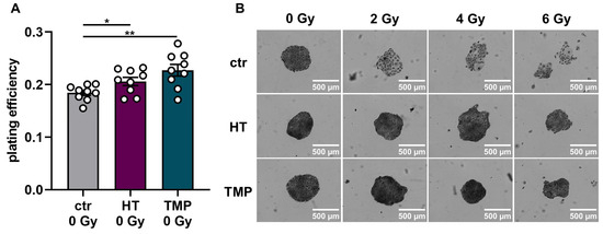 The treatment of HUVECs with HT and TMP both 24 h before and directly during irradiation had no effect on baseline cell survival (Figure 7A,D). However, significantly increased radioresistance of the cells was observed after treatment with HT and TMP for both treatment times (Figure 7B,C,E,F). In particular, HUVECs incubated with HT and TMP during irradiation showed increased radioresistance with increasing radiation doses (Figure 7E,F).