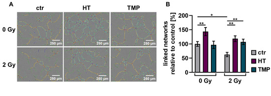 HUVECs were seeded into 6-well plates and treated with HT and TMP, as described above. After irradiation with a dose of 2 Gy, the cells were harvested and resuspended in Endothelial Cell Growth Medium 1 (ECGM-1, PromoCell, Heidelberg, Germany) supplemented with the provided supplement mix and 1% Penicillin/Streptomycin solution (PAN Biotech). After determining the cell number, 0.04 × 106 cells were added onto a growth factor-reduced polymerized Matrigel (Corning Inc., Corning, NY, USA) layer and incubated at 37 °C for 3 h. Pictures of 5 independent wells were taken for each sample and analyzed with the Angiogenesis Analyzer Plugin for ImageJ developed by Gilles Carpentier et al. [46]. The obtained results were calculated from three independent experiments and displayed as linked networks; untreated cells were used as the control.