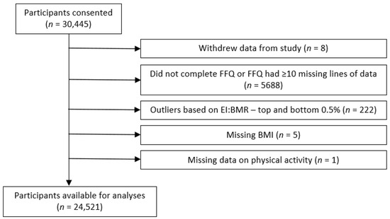 - Mulligan, A.A.; Luben, R.N.; Bhaniani, A.; Parry-Smith, D.J.; O’Connor, L.; Khawaja, A.P.; Forouhi, N.G.; Khaw, K.-T. A new tool for converting food frequency questionnaire data into nutrient and food group values: FETA research methods and availability. BMJ Open 2014, 4, e004503. [Google Scholar] [CrossRef]