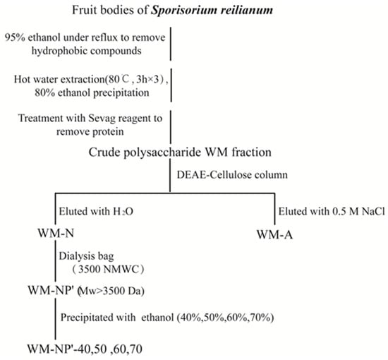 Following three washes with anhydrous ethanol, acetone, and ether, it was centrifuged at a speed of 3000 rpm for 15 min to obtain a precipitate. In total, 184 g of crude polysaccharide (WM) was successfully obtained by the freeze-drying process. Figure 1 shows the method of extracting and fractionating polysaccharides from S. reilianum.