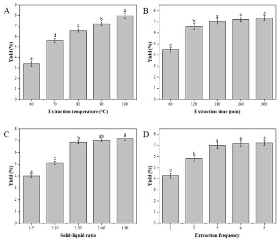 The yields of WM were evaluated under various extraction conditions, including temperature (A), time (B), solid–liquid ratio (C), and frequency (D). The effects of these factors on the yields were investigated. Note: different letters indicate significant differences (p < 0.05).