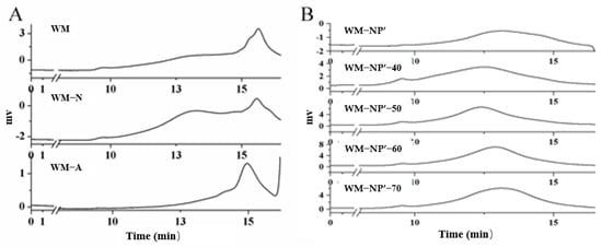 (A) HPGPC chromatogram of WM, WM-N, and WM-A; (B) HPGPC chromatogram of WM-NP’ products with different alcohol concentrations.