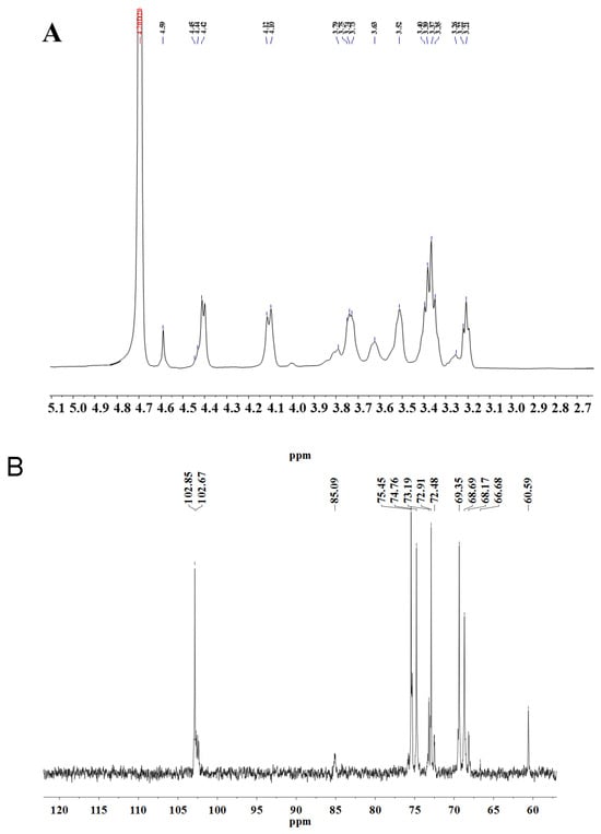 The monosaccharide composition was determined by HPLC after precolumn derivatization of the hydrolysate with PMP [22]. In short, the polysaccharide was hydrolyzed using 2.0 mol/L trifluoroacetic acid (TFA) at 120 °C for 1 h in a sealed tube. Any remaining excess acid was eliminated by drying at 45 °C with the addition of a small amount of ethanol post-hydrolysis. Following this, the dry hydrolysate samples or a standard aqueous solution of monosaccharides were combined with a 0.5 mol/L methanol solution of PMP (500 µL) and 0.3 M aqueous NaOH (500 µL) for derivatization at 70 °C for 30 min. Subsequently, the mixture was centrifuged at 10,000 rpm for 5 min. HCl (50 µL, 0.3 mol/L) was introduced to the mixture solution, followed by extraction with chloroform. The resulting aqueous layer was then filtered through a 0.22 µm membrane for subsequent HPLC analysis. Subsequently, the filtrate (10 µL) was injected into a DIKMA Inertsil ODS-3 column (4.6 × 150 mm). PMP-tagged monosaccharide analysis was conducted using a Shimadzu LC-10ATvp HPLC system from SHIMADZU in Kyoto, Japan, which was outfitted with a UV detector set at OD245nm. The mobile phase consisted of a blend of PBS (0.1 mol/L, pH 7.0) and acetonitrile (81:19) and elution was performed at a flow rate of 1.0 mL/min.