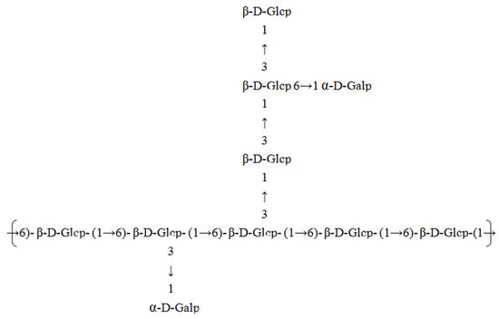 According to the results of the monosaccharide composition determination, periodate oxidation, Smith degradation, NMR analysis, and methylation analysis, the structure of WM-NP’-60 was inferred in Figure 8. The main structure consists of β-1,6-D-Glcp forming the main chain, with side chains attached to the main chain via glycosyl bonds at the C-3 position. The side chain is made up of β-1,3-D-Glcp, while the glucan structure comprises β-1,3,6-D-Glcp.