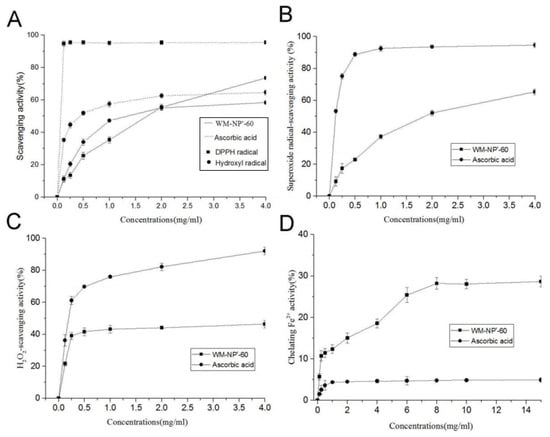 The compounds’ hydrogen-donating properties are mostly responsible for their DPPH-scavenging efficacy. In Figure 9A, the scavenging activity of WM-NP’-60 varied as a function of concentration. The fact that its EC50 value for scavenging DPPH free radicals was so low (1.74 mg/mL) suggests that WM-NP’-60 is a potent antioxidant. However, its capacity to inhibit was diminished when compared to that of ascorbic acid.