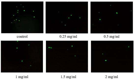 The DCFH-DA without fluorescence can freely cross the cell membrane and enter living cells and is then hydrolyzed to produce DCFH, which cannot easily pass through the cell membrane. In the presence of ROS, DCFH is oxidized to produce the fluorescent 2′,7′-dichlorofluorescein (DCF) [30]. According to Figure 10, in contrast to the control group, the ROS levels in cells gradually decreased with the increasing concentration from 0.25 to 2 mg/mL of WM-NP’-60.