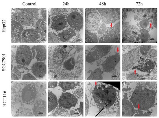 TEM of HepG2 cells, SGC7901 cells, and HCT116 cells treated with WM-NP’-60 at 4 mg/mL. The red arrow points to the appearance of apoptotic bodies.