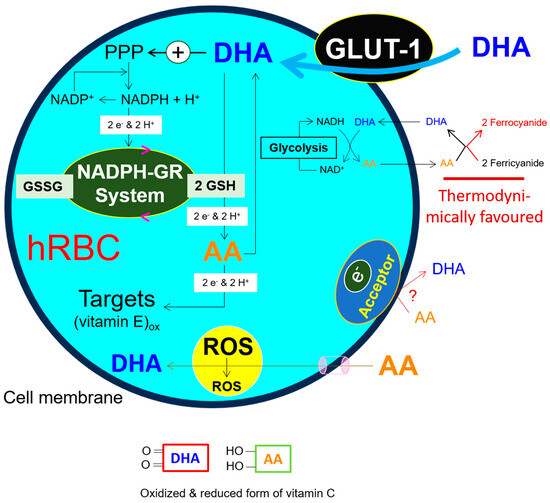 - Sage, J.M.; Carruthers, A. Human erythrocytes transport dehydroascorbic acid and sugars using the same transporter complex. Am. J. Physiol. Cell Physiol. 2014, 306, C910–C917. [Google Scholar] [CrossRef]