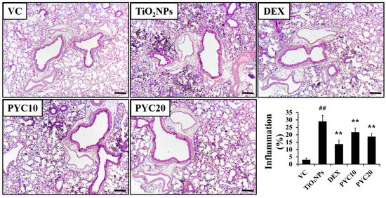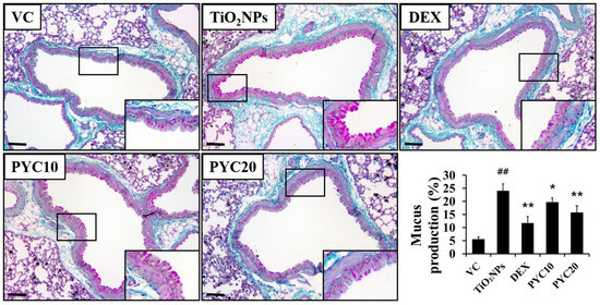 3.3. PYC Ameliorates Airway Inflammation and Mucous Production in TiO2NP-Exposed Mice