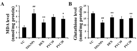 3.4. PYC Reduces ROS Production in the Lungs of TiO2NP-Exposed Mice