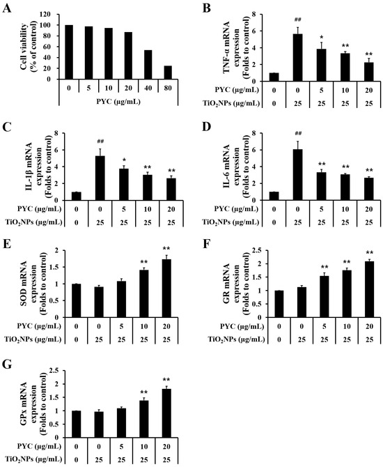 3.6. PYC Inhibits mRNA Expression of Proinflammatory Cytokines and Activates mRNA Expression of Antioxidant Enzymes in TiO2NP-Induced NCI-H292 Cells