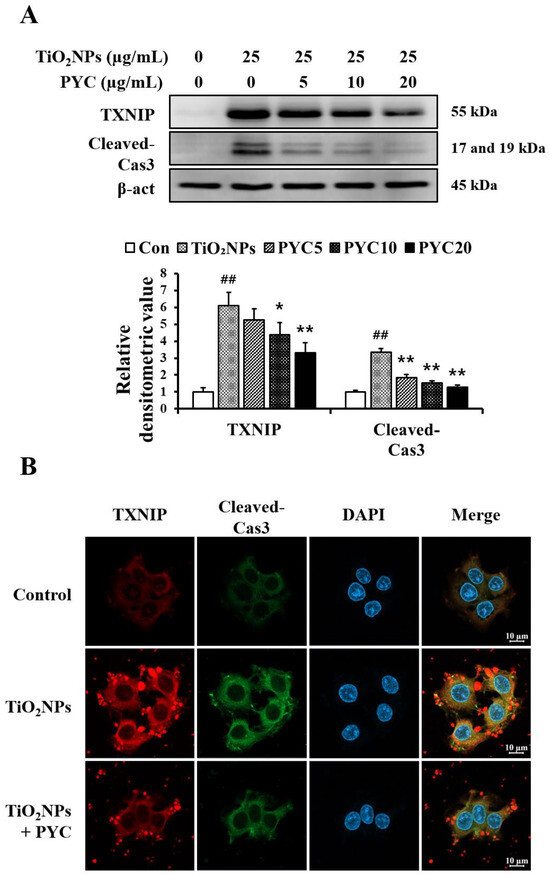 Chicago/Turabian StyleLim, Je-Oh, Woong-Il Kim, So-Won Pak, Se-Jin Lee, Changjong Moon, In-Sik Shin, Sung-Hwan Kim, and Jong-Choon Kim. 2024. "Pycnogenol-Assisted Alleviation of Titanium Dioxide Nanoparticle-Induced Lung Inflammation via Thioredoxin-Interacting Protein Downregulation" Antioxidants 13, no. 8: 972. https://doi.org/10.3390/antiox13080972