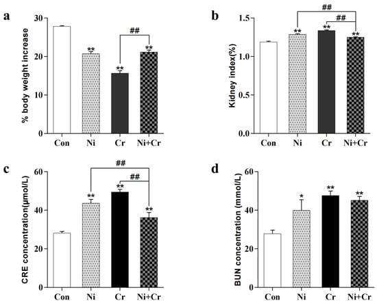 Body weight growth rates are shown in Figure 1a. Each exposure group showed an extremely significant decrease in body weight growth rate compared to the control group (p < 0.01). The Ni + Cr group showed a significant increase in body weight growth rate compared to the Cr group (p < 0.01). Renal coefficients, as shown in Figure 1b, were significantly higher (p < 0.01) in all exposed groups of mice compared to the Con group, and showed a significant decreasing trend (p < 0.01) in the Ni + Cr group of mice compared to the Ni and Cr groups. Renal function results are shown in Figure 1c,d. Serum creatinine (CRE) and urea nitrogen (BUN) levels were significantly increased in all exposed groups of mice compared to the Con group (p < 0.01), and CRE levels were significantly decreased in the Ni + Cr group compared to the Ni group and Cr group (p < 0.05 or p < 0.01).