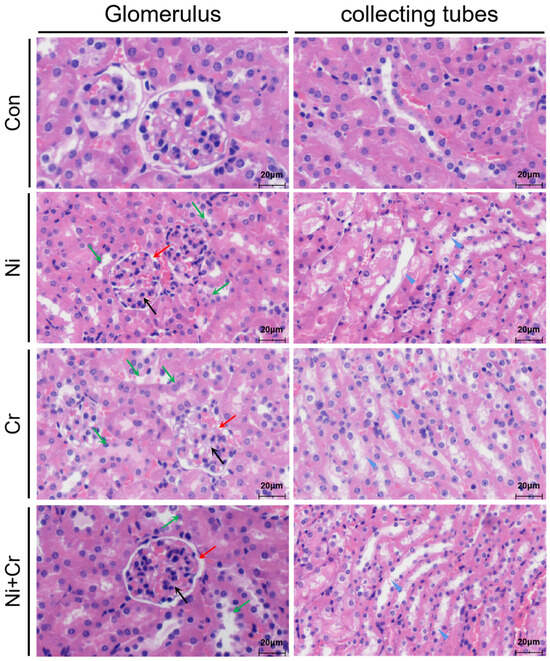 Histology of nickel–chromium on kidney pathology in mice (scale bar: 20 μm). Note: black arrows show glomeruli; red arrows show the narrowing of the lumen of the renal capsule; green arrows show degeneration, necrosis, and shedding of epithelial cells in the lumen of the renal tubule; blue triangles show the shedding of cells and cellular debris in the collecting ducts.