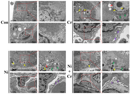 Effects of nickel–chromium on mice kidney tissue ultrastructure. Note: red arrows show nuclear membrane crumpling; yellow arrows show chromatin condensation; green arrows show mitochondrial swelling and distortion of morphology; purple arrows show fusion of peduncle protrusions with curved and swollen morphology. The red dashed box is a partial zoom.