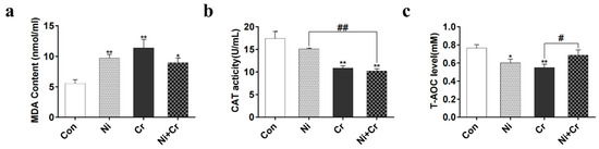 Effects of nickel–chromium on oxidative and antioxidant indices in mice. (a) Levels of MDA. (b) Activity of CAT. (c) Levels of T-AOC. Note: the symbol “*” indicates significant differences compared to the control group (* p < 0.05, ** p < 0.01); the symbol “#” indicates significant differences between the corresponding experimental groups (# p < 0.05, ## p < 0.01).